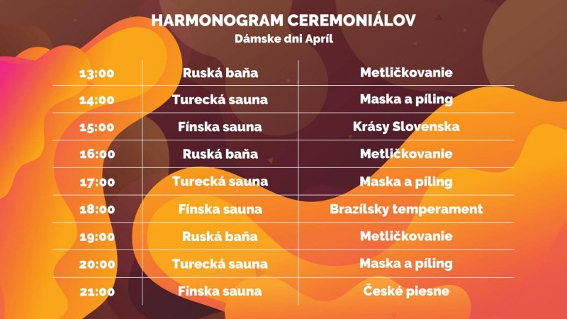 Vždy druhý utorok v mesiaci patrí v zimnej sezóne tým nežnejším polovičkám. Saunovanie, ceremoniály, pílingy, masky, metličkovanie a samozrejme preberanie všetkých životných starostí a radostí.